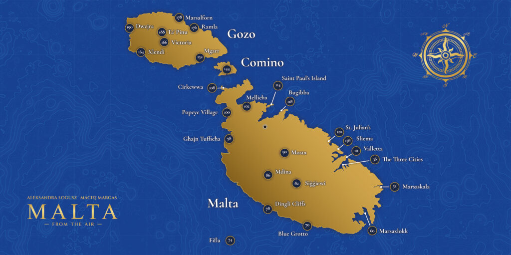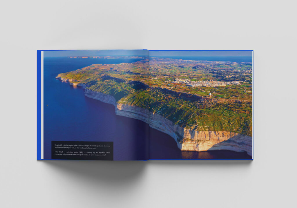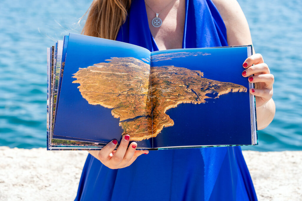 Across over 200 pages, the album presents Malta’s cities, coastline and landscapes as seen from above – revealing patterns, contrasts and spatial relationships that remain hidden at ground level. From the historic fabric of Valletta and the Three Cities, through the calm geometry of Mdina, to the rugged cliffs of Dingli and the turquoise waters of Comino and Gozo, each photograph contributes to a cohesive visual narrative of the island.